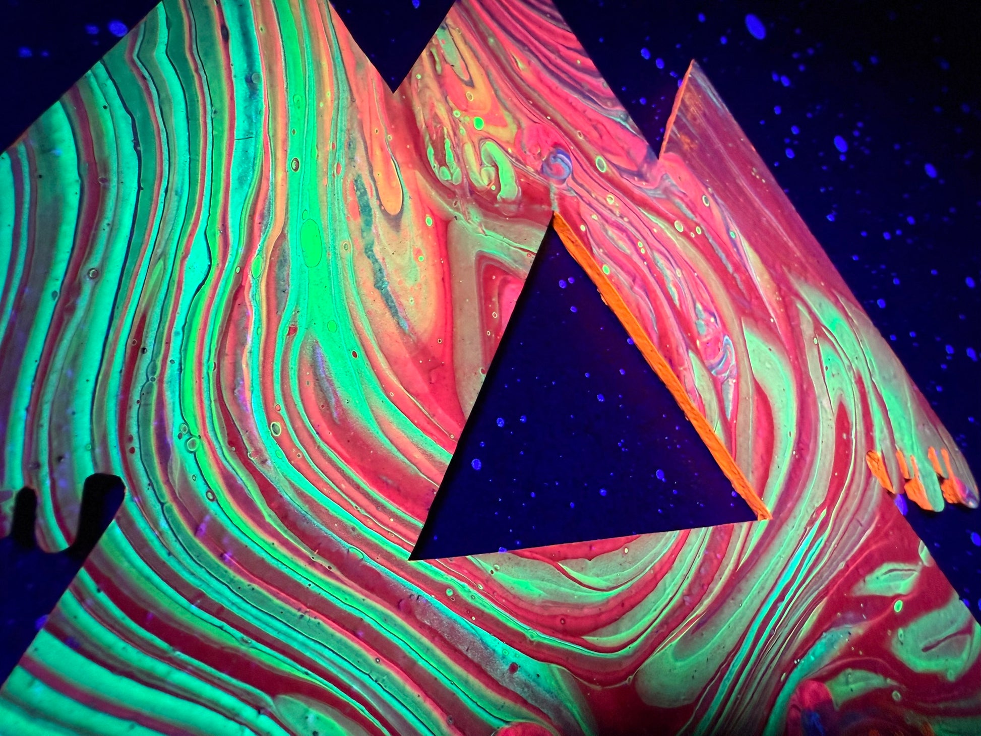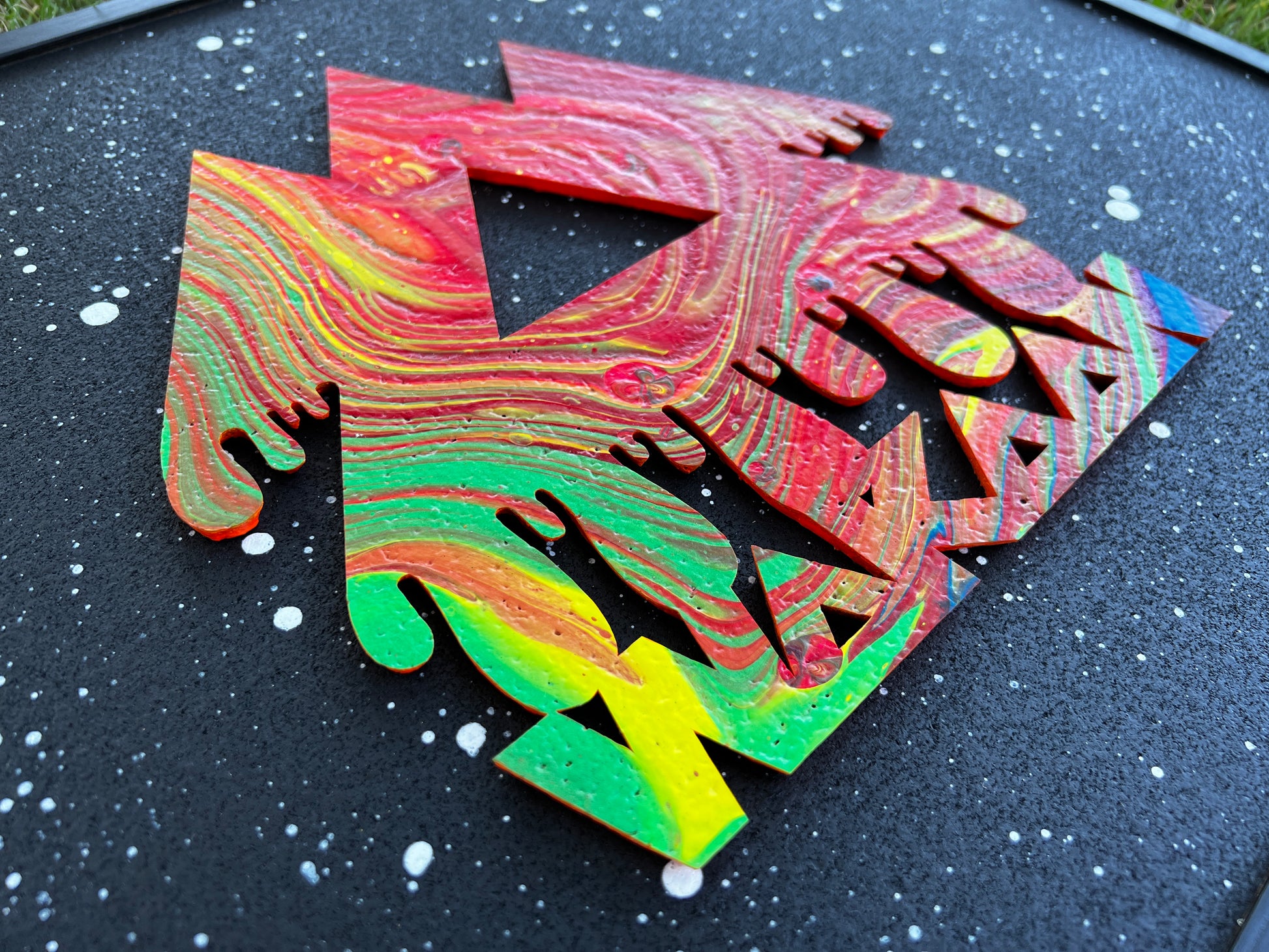 This unique 1/1 piece of art is made using a combination of mediums and techniques. This single sheet of cork is cut by hand with an X-ACTO blade, and the sides of the pieces are hand painted. Spray paint is used for the cork board, and acrylic pour painting for the design. The stars are made with glow in the dark paint. After the design has been glued onto the cork board each piece is signed with a hand carved stamp.