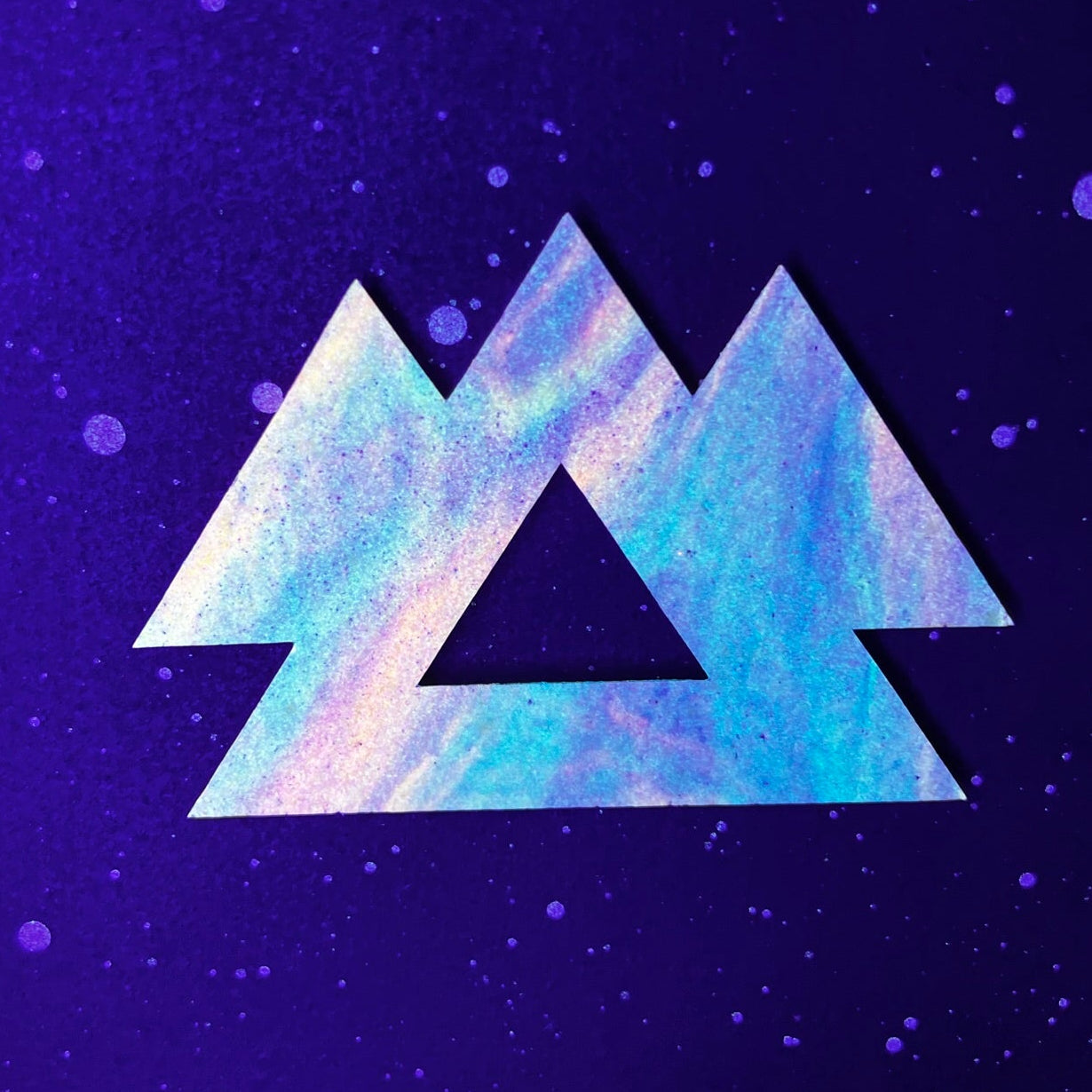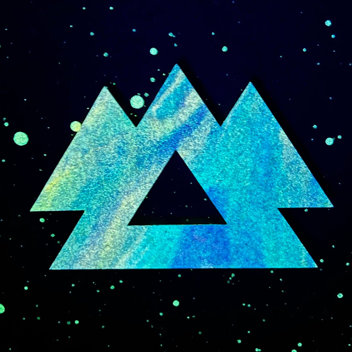 This unique 1/1 piece of art is made using a combination of mediums and techniques. This single sheet of cork is cut by hand with an X-ACTO blade, and the sides of the pieces are hand painted. Spray paint is used for the cork board, and acrylic pour painting for the design. The stars are made with glow in the dark paint. After the design has been glued onto the cork board each piece is signed with a hand carved stamp.